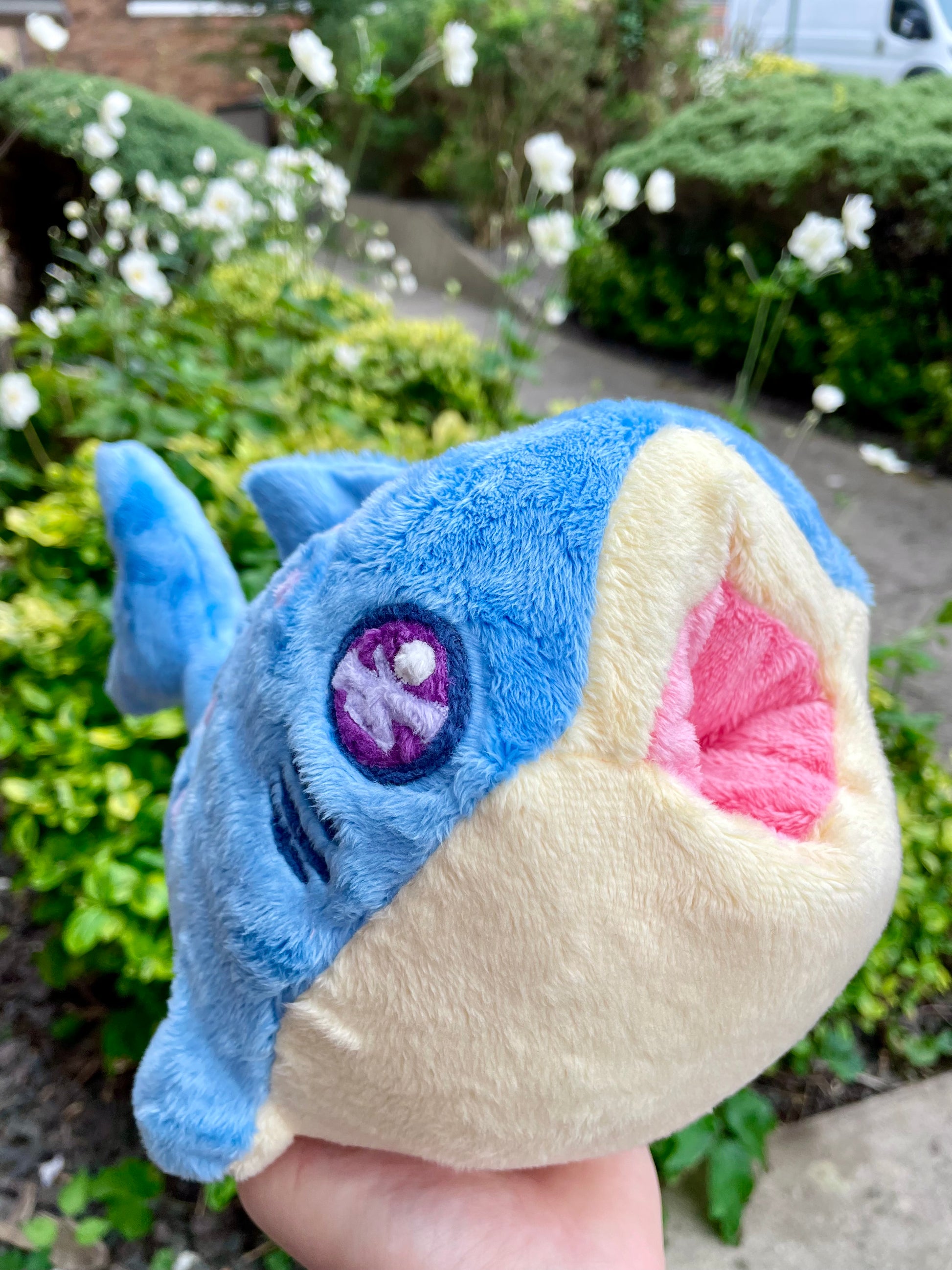This beautiful whale shark plush has got a super soft upper body in a gorgeous blue, with a soft baby, pastel yellow underside. Possibly the best thing about this plush is its open mouth, the biggest characteristic of a whale shark. This plush has just that, and the mouth opening is actually big enough to put my hand in, so a very large pocket! The soft pink colour in the mouth is great accompaniment to the ocean blue, but also the dark colour for the gills and outer eyes, giving a sort of dreamy look. It can sit up by itself, with the assistance of some poly pellet beads towards the tail, so that makes the plush weighted too. The plush is roughly 9” tall (including upturned tail), 7” wide and 11” long
