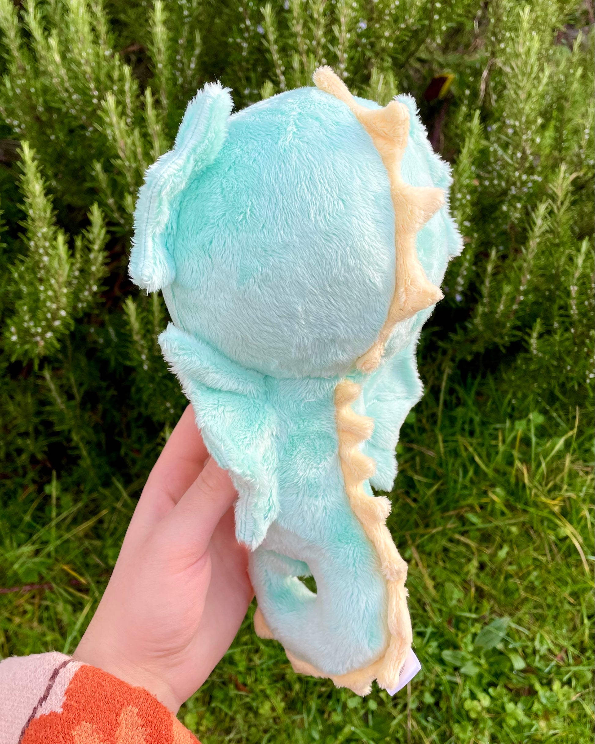 This gorgeous seahorse plush is made of the softest minky plush fabric, and has got applique accents for the eyes made of the same soft textures. The seahorse has got yellow frills running down the back of the head and body, as well as a super complimentary green belly. The plush also has a characteristic curled tail, manitained by the perfect amount of stuffing. The plush is roughly 9” tall and 5” wide.